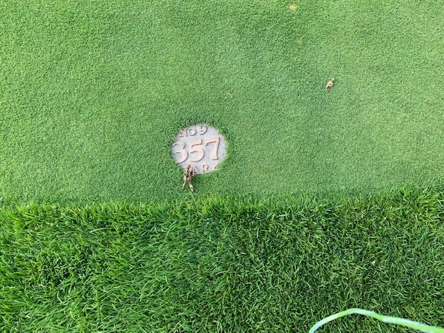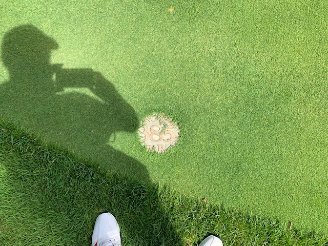 9番357yミドルは、3wで右ラフへ。8アイアンで完璧球と思ったが、バンカーイン。N.Tさんも同じバンカーイン。で、バンカーショットは私が3mに。N.Tさんが奥のカラーへ。で、お互いが外してボギー。平和なイーブンとなりました。