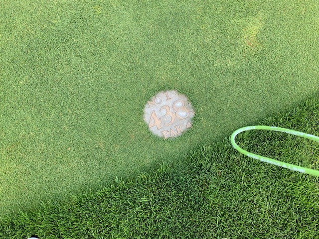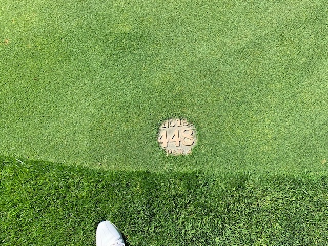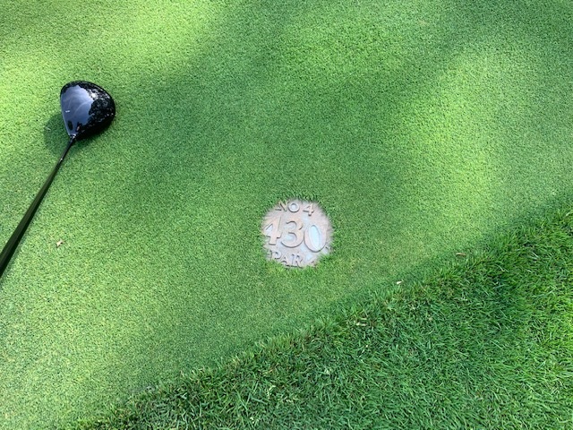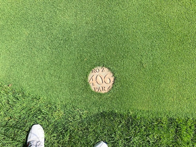18番448yミドルは、ドライバーはちょいショボ。池越えを3wで残り50yへ。3オンのボギー。ラッキーにもイーブンでインを終了。