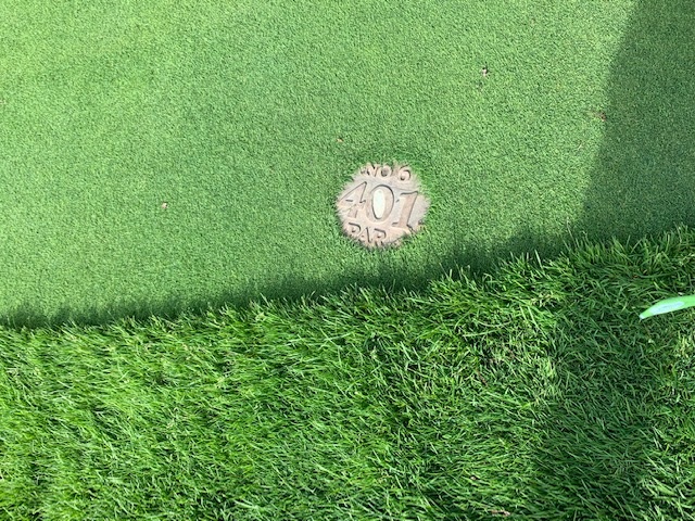 14番385y水難が待ち構えるホールは、ドライバーは竜巻球でお池へ。ドロップしての3打目を6アイアンで打つも今度は前方のお池を越えず。またまたドロップ。5打目を打つもまたまた池へ。ニューボールが。。。7オンの9となる。ゲボッ!1アップ。