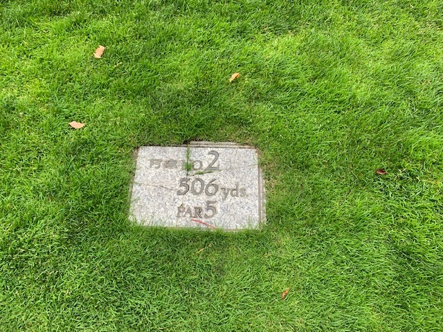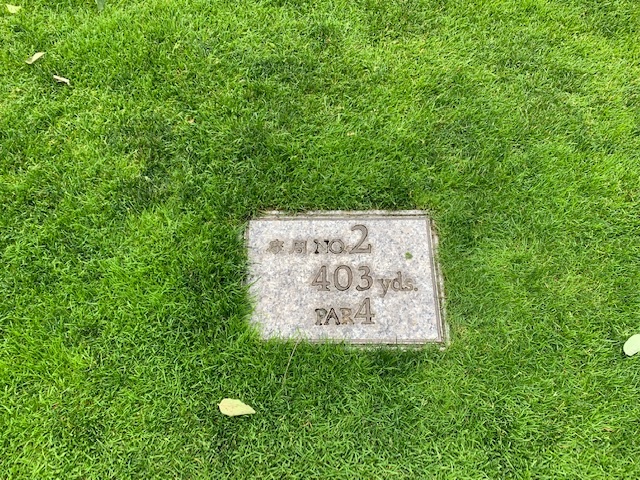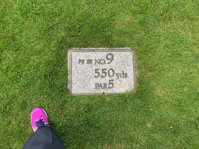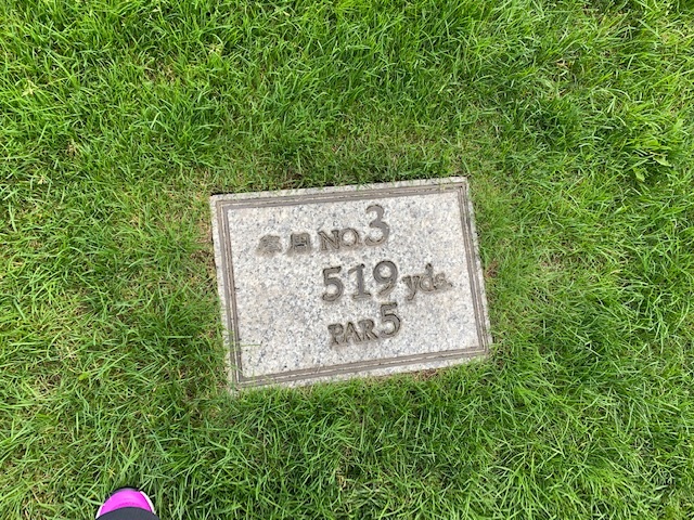8番580yロングは、ドライバーは右の長い芝のフェアウェイへ。3w、25度の3打目は左へ。寄らず入らず。