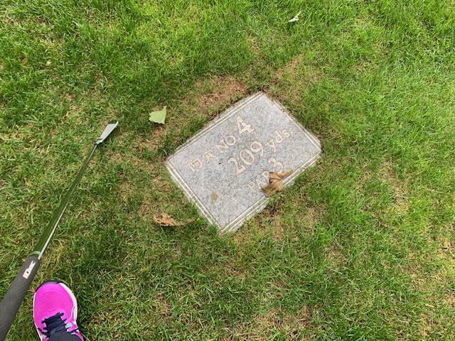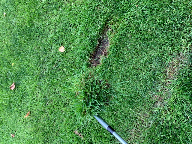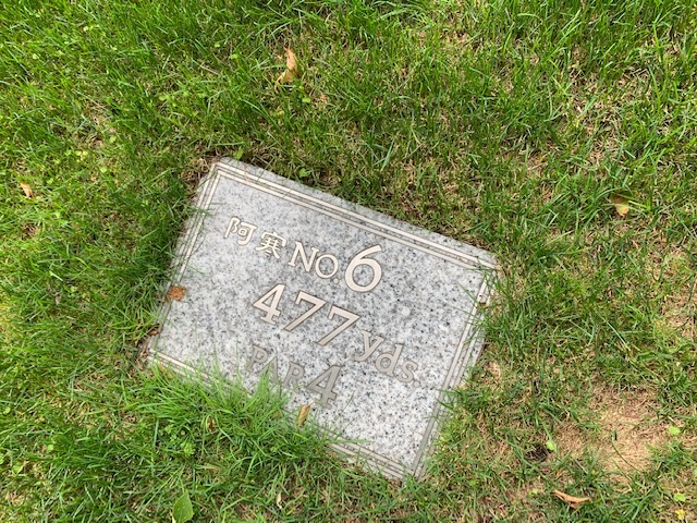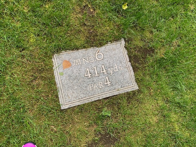5番445yミドルは、整備不良的なホールでしたが、ドライバーは生い茂っているセンターの木に当たる。3w、56度で3オン。なんとかボギー。3打目のウエッジに芝が絡み付き、綺麗にターフが土とともに乗りました(大笑)。写真参照。素晴らしい1,2打で10mに2オンさせていたR.Sさんが今日もバーディ。3日間ともバーディ奪取という快挙です!