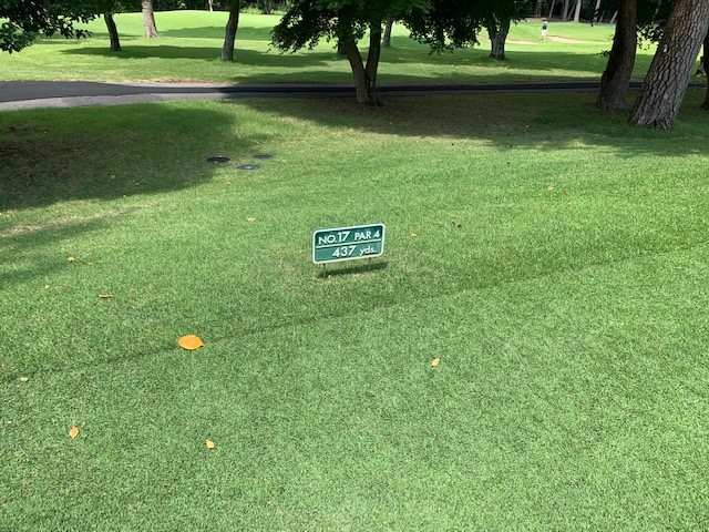 16番428yミドルは、ドライバーは右へ。3uで打つもショボ。寄らず入らず。ナイスアプ&パターでS.Hさんがパー。