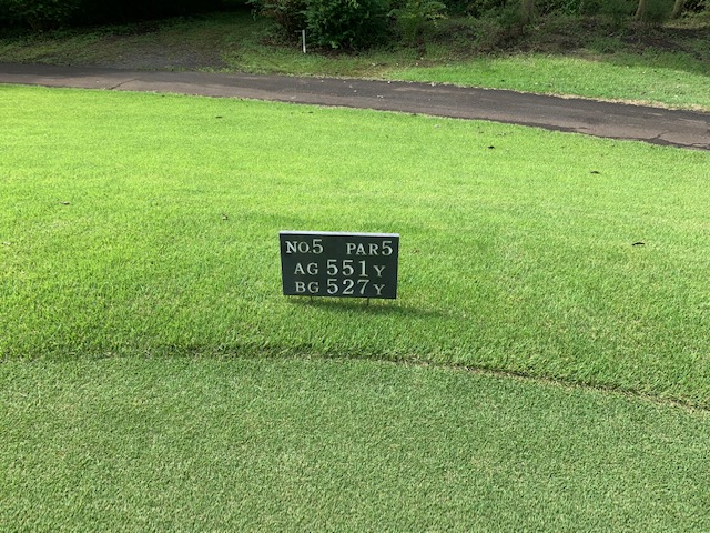 5番551yロングは、ドライバーは左ラフへ。3u、6アイアンでピン右9mに3オン。無難にパー。