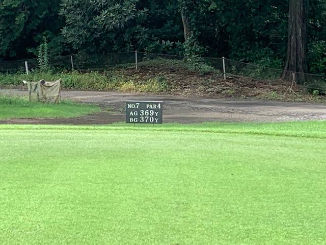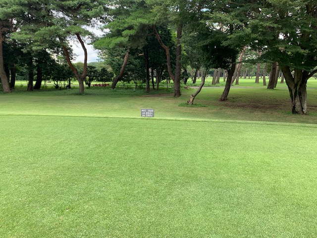 7番369yミドルは、ドライバーは左ラフへ。PWでのセカンドは木に当たるもゲイン。なんとか寄せてパー。