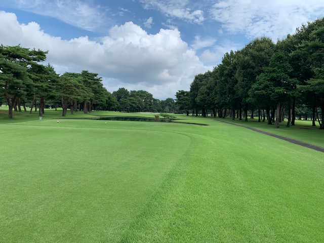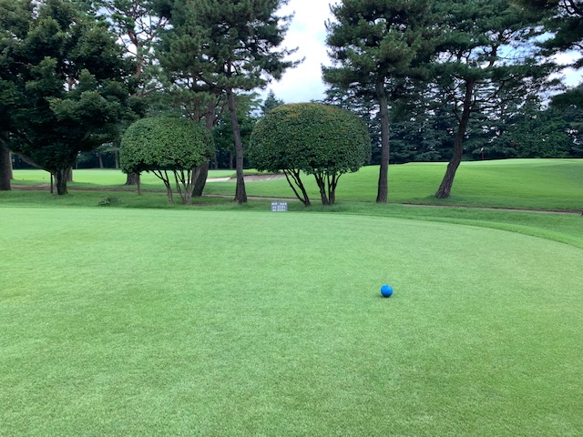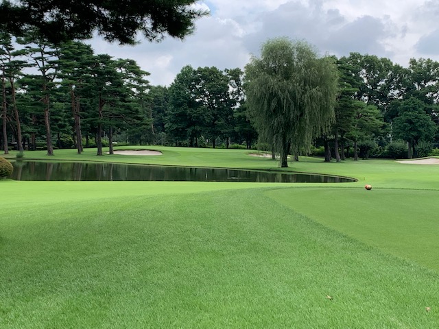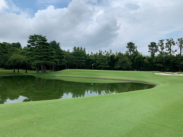 9番529yロングは、ドライバーはまずまず。3wがショボ。も、なんとか左の池の手前のラフへ。PWで3オン。無難にパー。