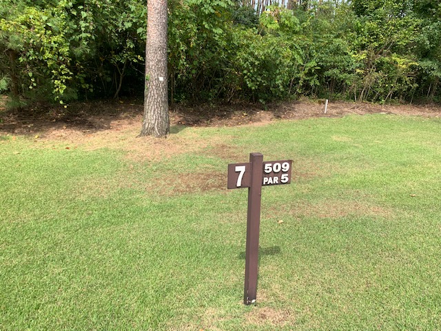 7番474yロングは、ドライバーは竜巻球で林入口へ。5アイアンで狭い空間を射抜こうとしたが、カーン。3打目もカーン。4打目でアウト。52度で5オン。ダボ。