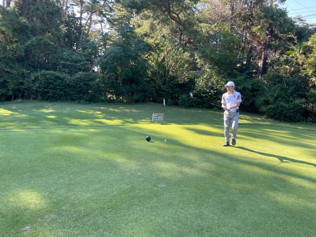 10番544y左ドッグのロングは、ドライバーはヘナチョコ球。6アイアン、3w、56度で7mに4オン。ボギー。見事なアプ&パターでK.Tさんがパー奪取。