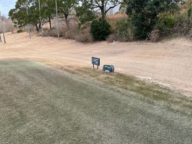 アウトからスタート。今日は若い男性キャディのYさんが付いてくれます。白ティしか出来ないというので、白ティで進行します。ここは1グリーンのようです。