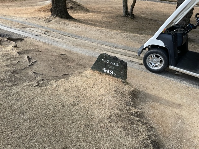 5番449y上りのロングは、ドライバーは右ラフへ。3uでナイス位置へ。52度で4mに3オン。放り込んで奥道後初のバーディゲット。