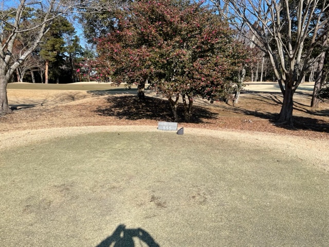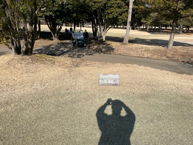 15番536yロングは、ドライバーはナイス。3wもナイス。が、ここはあまり飛んだのは良くなかったようで木の後ろ。56度を思いっきり開いての3打目は木を越えてナイス3オン。無難にパー。カラーからパターでK.Iさんが、また、5mに3オンのI.Nさんも無難にパー。