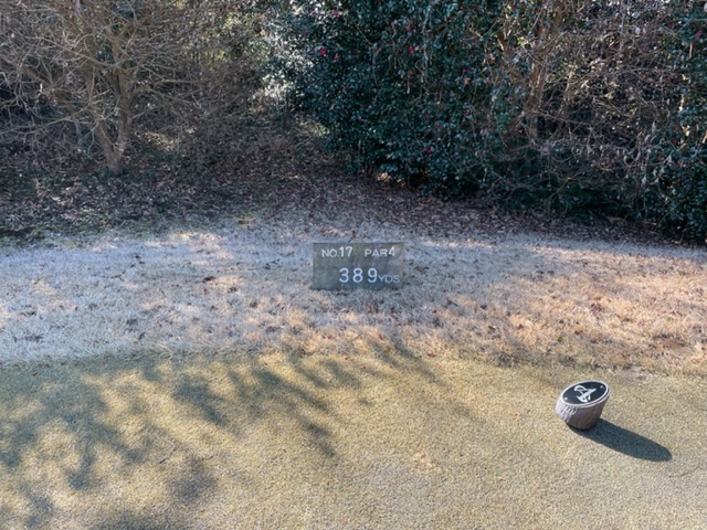 11番386yミドルは、ドライバーは左へ。3uで打つもショボ。PWで打つも乗らず。ダボ。ここも2オンからK.Iさんが無難にパー。