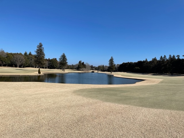 18番左ドッグのお池が綺麗な555yロングは、ドライバーはナイス。3w、52度で右のバンカーイン。初めてバンカーがナイスでパー。しっかり3オンのI.Nさんが無難にパー。