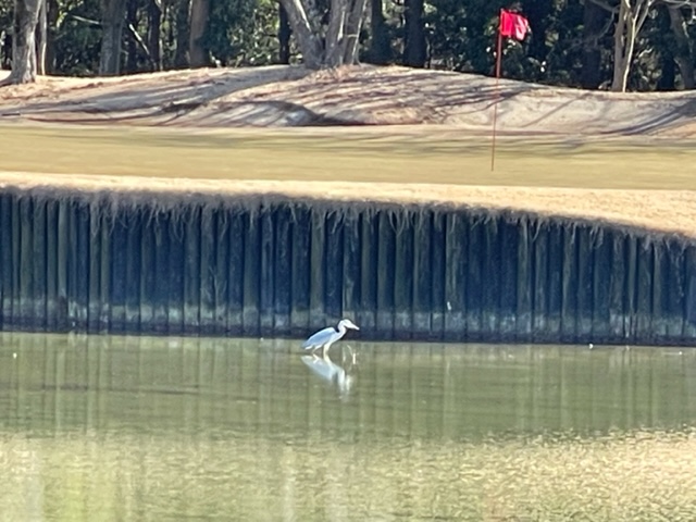 7番425y右ドッグの池越えミドルは、ドライバーは完璧もやっと池を越えた位置。飛ばない男である。残り188yアゲンストを3wでピン左12mに2オン。無難にパー。同じく2オンからK.Îさんも無難にパー。