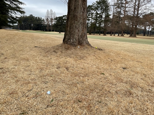 18番375yミドルは、ドライバーは竜巻球で木に当たり右手前へ。3u、56度で3オン。ボギー。