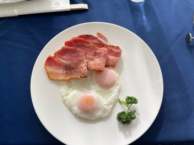 レストランで縁の面々と朝のミーティングです。私は今日は目玉焼き2個とベーコンにしました。その後、アウトから。我々はアクセサリーを入れてますが、どうか気にしないで調査しながら楽しまれてくださいと主役のM.Aさんにお話する。