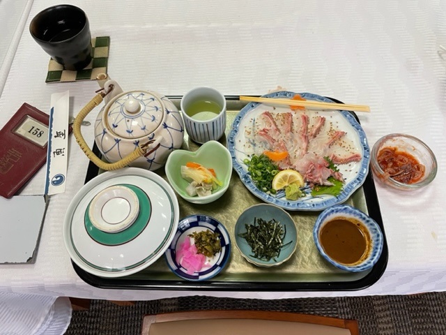 到着後、着替えて、2階レストランで魚屋の鯛茶漬けを食す。うん、量も多いし、ナイス。で、いつものイカの豆板醤を芋のお湯割りとともにいただく。ハッピーハッピー。ただ、テーブルクロスが超汚かった。これはかなりマイナス材料でした。