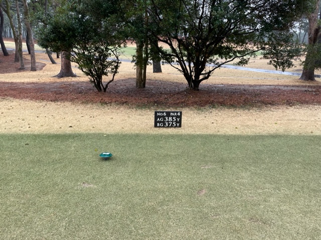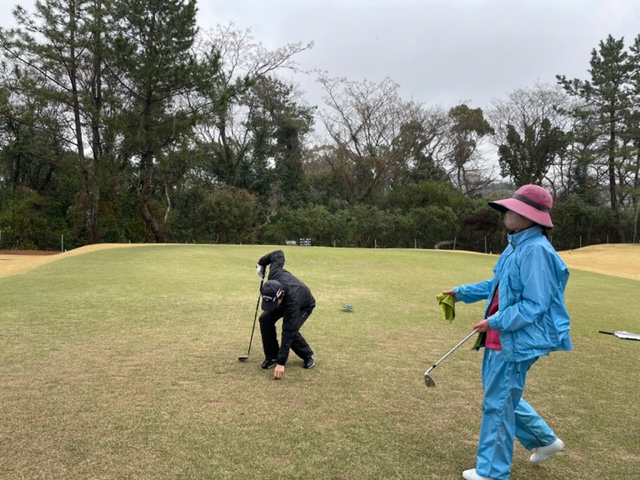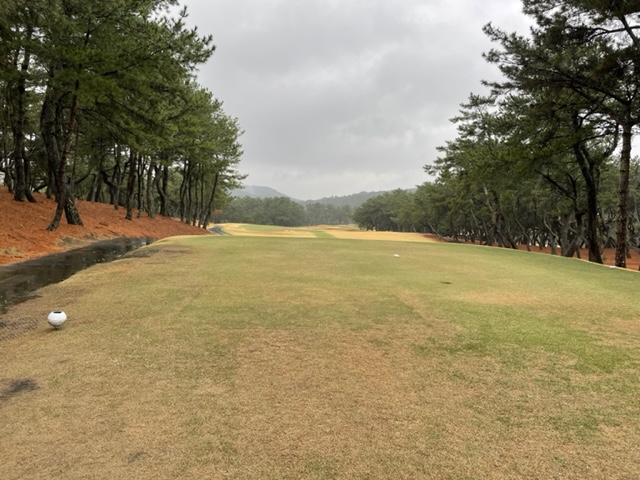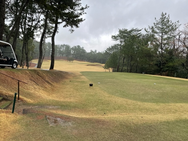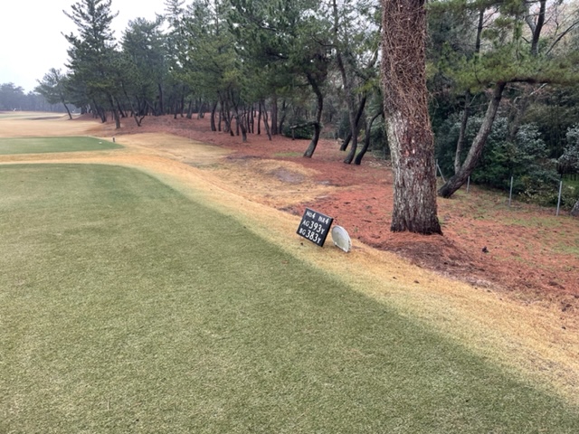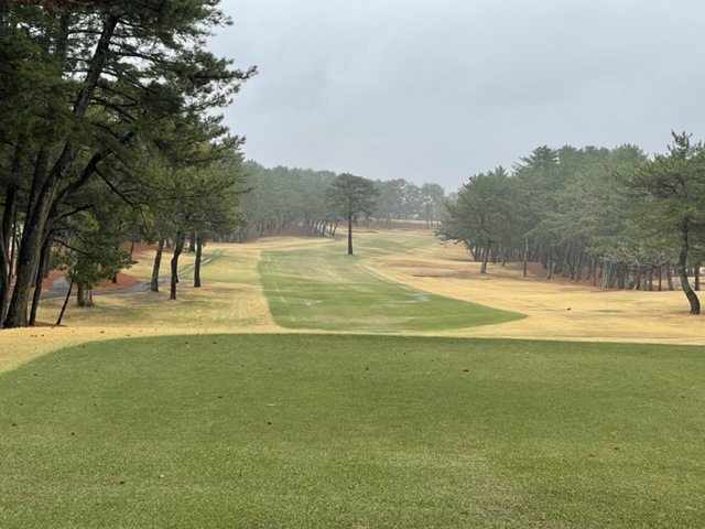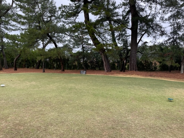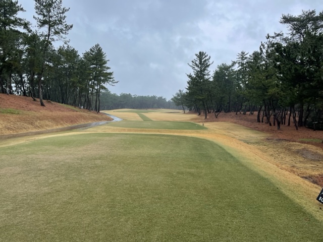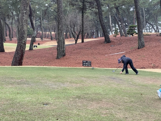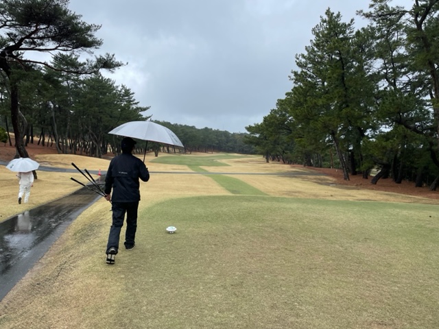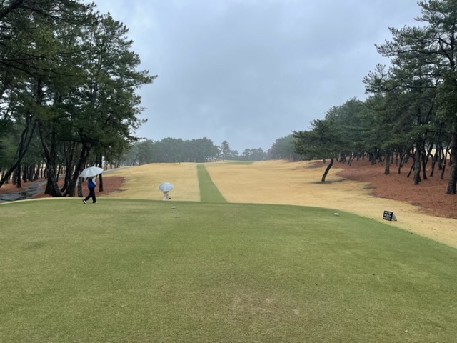 時間になり、合羽を着て、アウト1番からティオフ。今日はBグリーンで黒の前の緑ティから進行します。
