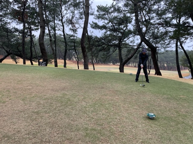16番355y左ドッグミドルは、ドライバーはナイス。7アイアンで打つも花道へ。ナイスアプでパー。見事な2オンからK.Tさんが無難にパー。