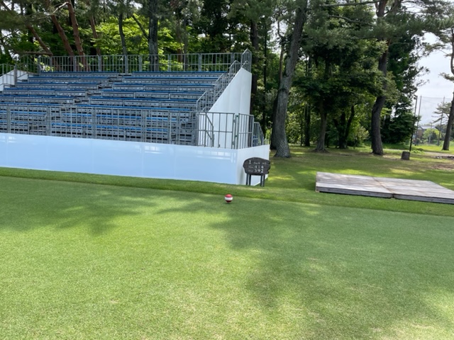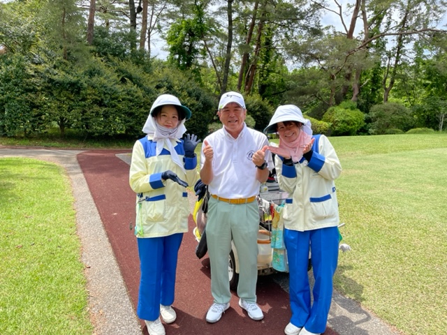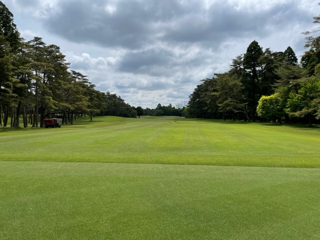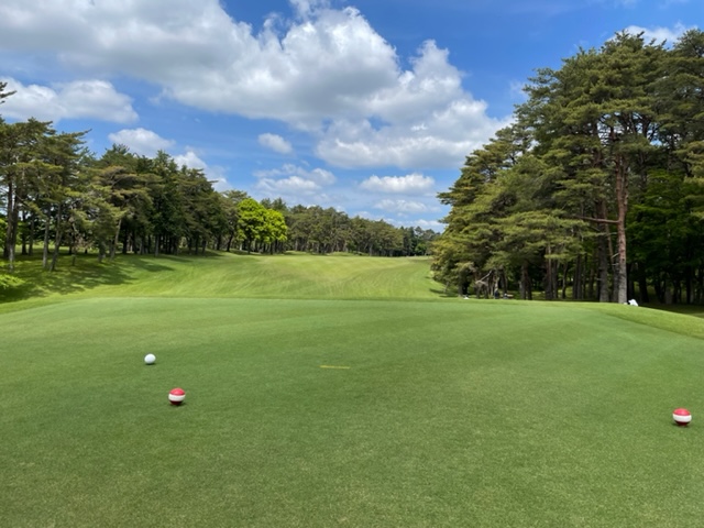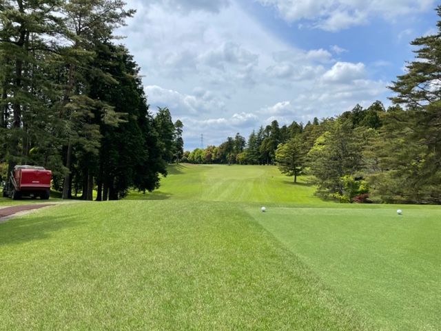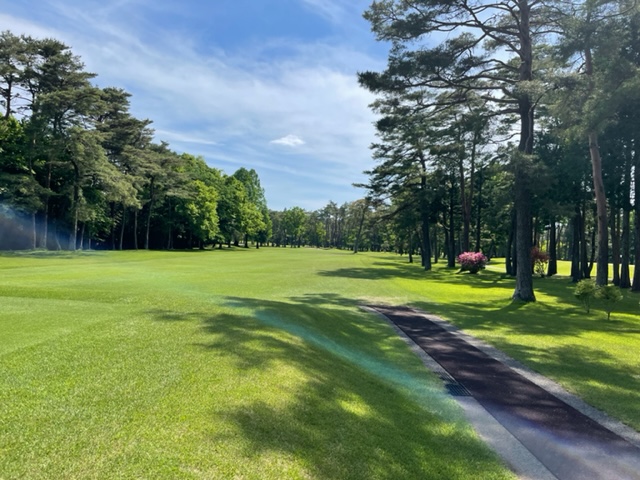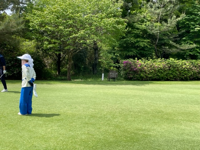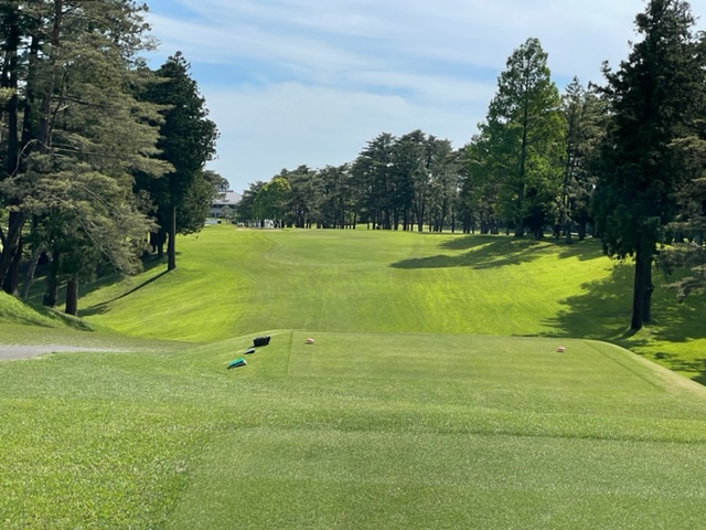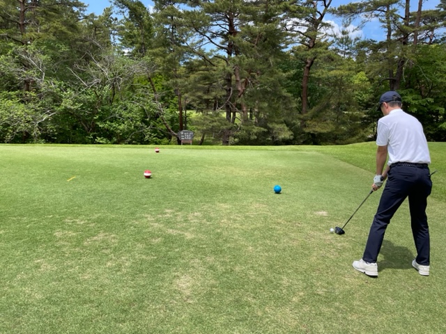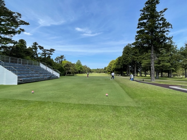 いざ、アウトから。来週の女子プロトーナメントの準備が着々と進んでいます。今日はグリーンはNEW、ティは青ティで進行します。ほぼ女子プロのティとなりますでしょうか。今日はキャディが2名と贅沢です。