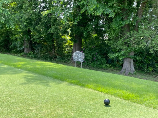 4番418y右ドッグミドルは、ドライバーは竜巻球。6アイアンで斜め前方へ。52度で3オン。ボギー。