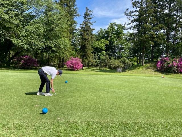 15番380yミドルは、ドライバーは右のクロスバンカーイン。8アイアンで打つも土手に当たる。3打目をPWで打つも奥のカラーへ。パターで打つとなんとカップイン。ダイヤモンドパー。見事な2オンからK.KさんとS.Sさんが無難にパー。