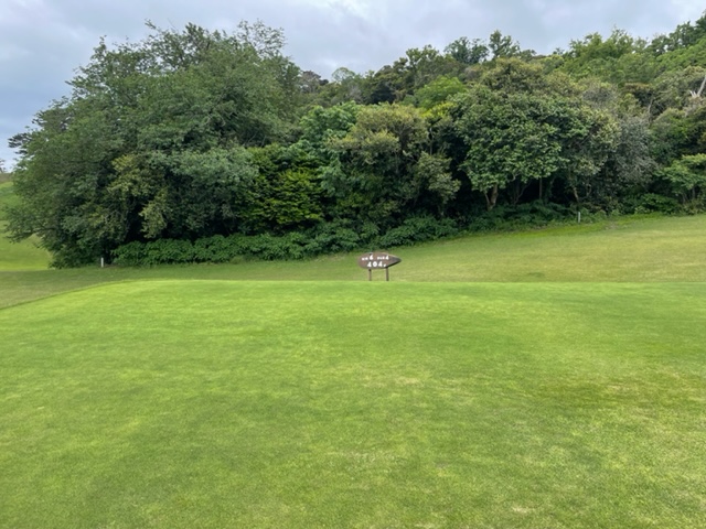 3番420y打ち上げロングは、ドライバーは左ラフへ。枝が出ており6アイアンでのセカンドはローボールで。残り90y打ち上げをPWで打つも左奥へ。寄らず入らず。