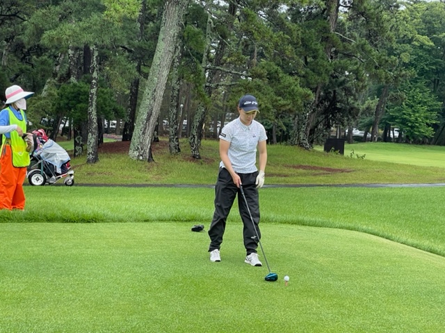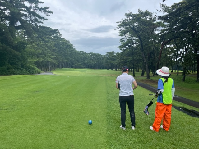 インから。今日は今年の女子プロテスト最終会場の大洗でプレーをしておきたいというM.KさんとそのM.Kさんを応援するS.Mさんと要人S.Mさんとのラウンドです。今日はS.Mの人が3人いますね。ティイングエリアはその時使う距離のもので進行します。