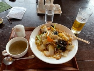 到着後、時間があったので、食事に行く皆様とは別れ、私はサウナ・水風呂タイムを楽しみます。ここは香りがあって、今日の香りはシトラスです。ここは環境がホント素晴らしいです。50分ほど堪能し、レストランへ。あんかけ堅焼きそばを食します。なかなかグーです。