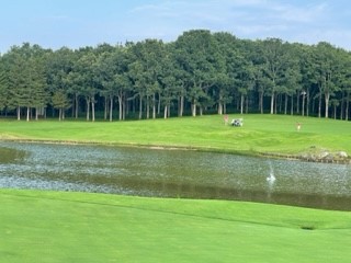 14番362yミドルは、ドライバーは竜巻球で最後にお池にジャブン。ドロップして8アイアンで2.4mに3オンとしたが、パターが入らず。