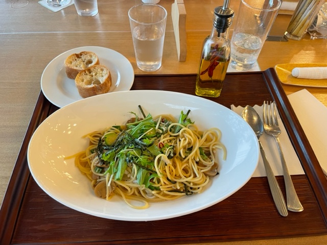 早めのランチ。私はオクラのパスタを食す。なかなか旨い。ここは1か月に1度メニューが変わるのでありがたい。