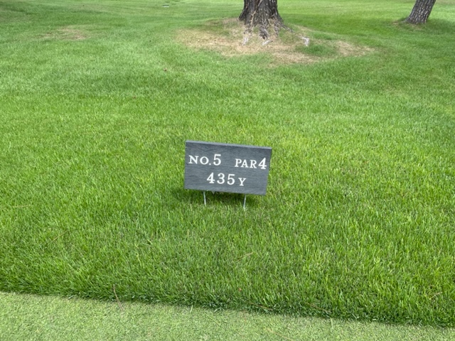 5番435y左ドッグのミドルは、ドライバーは竜巻球。セカンドを5アイアンで狭い空間を打つも木に当たる。なんとかPWで3オン。ボギー。