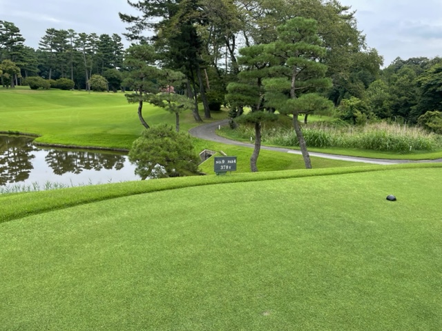 9番378y右ドッグのミドルは、ドライバーは右ラフへ。木があるが8アイアンでグリーン左サイドを狙う。カラーからパターで寄せて銅パー。