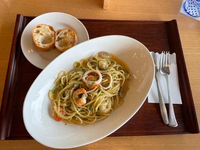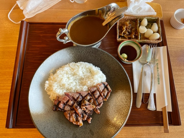 ランチは、今日はステーキカレーをいただく。これはマジ美味い。食べかたはワサビ醤油で食す。私はこのステーキを単品でも最高です。これにご飯とみそ汁で完璧です。サラダはタケさんに食べてもらいました。にこやかなお顔で最高ですね。