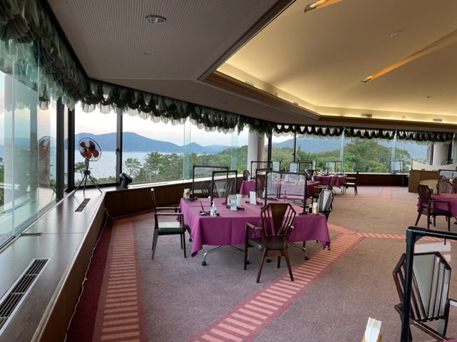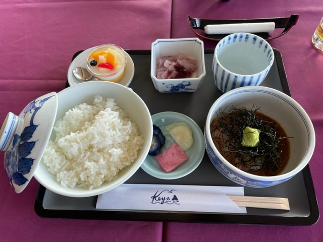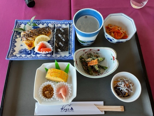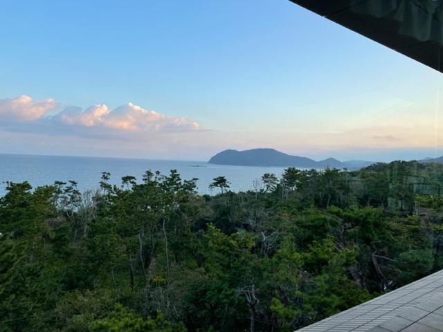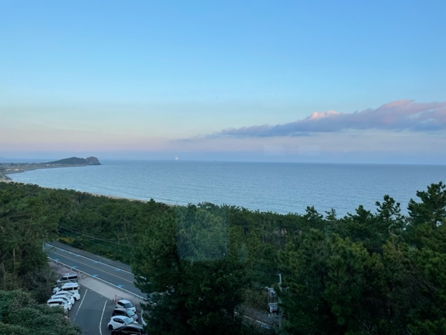朝、レストランからの眺めが超素晴らしい。ここからの玄界灘の眺めはホントべリーグッドです。焼酎と和朝食と眺めと語らいで1時間があっという間です。