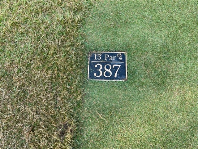 13番395yミドルは、ドライバーはまずまず。残り165y上りを5アイアンで打つもカラーへ。ここからパターで打つもこれまた3回掛かる。下手過ぎる。カラーからしっかり2回で行ったJ.Kさんがパー奪取。腕を上げておられます。