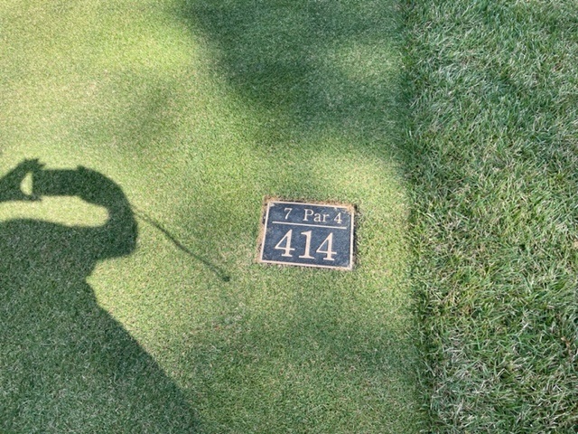 7番414yミドルは、ドライバーは完璧。4アイアンでのセカンドは右に飛んでバンカーイン。寄らず入らず。