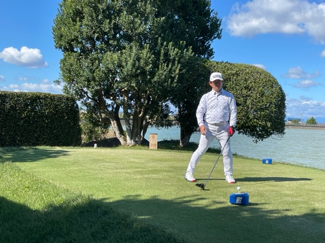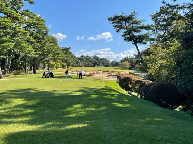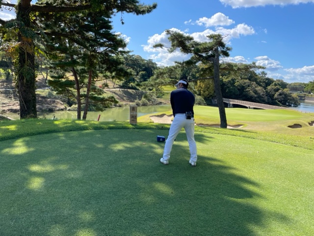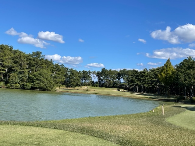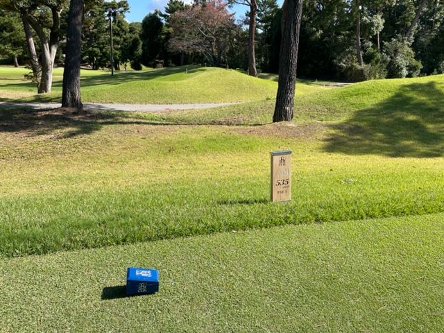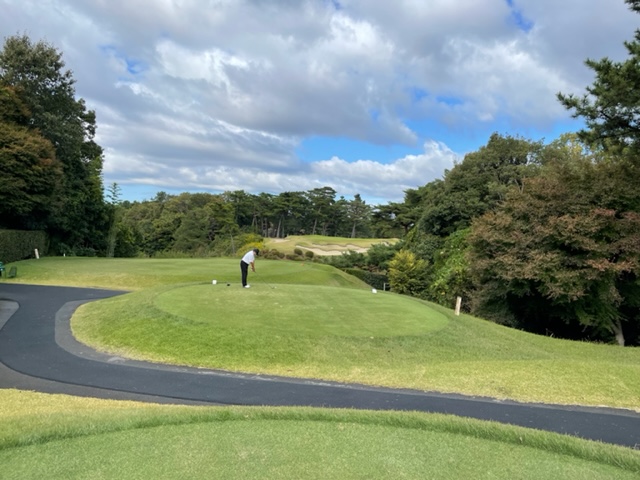 9番561yロングは、ドライバーは竜巻球。左ラフの位置にある球は左足下がりのややこしい位置に。6アイアンでなんとかゲイン。残り210yアゲンストを3wで打つとなんと2mに3オン。やんややんや。これを沈めてナイスバーディ。