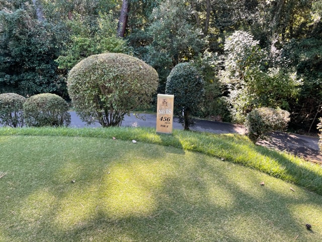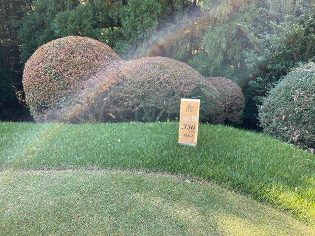 8番356yミドルは、ドライバーはヘナチョコ球でバンカーイン。8アイアンで打つも手前のバンカーイン。寄らず入らず。ビッグドライブから楽々2オンのN.Yさんが残念パー。