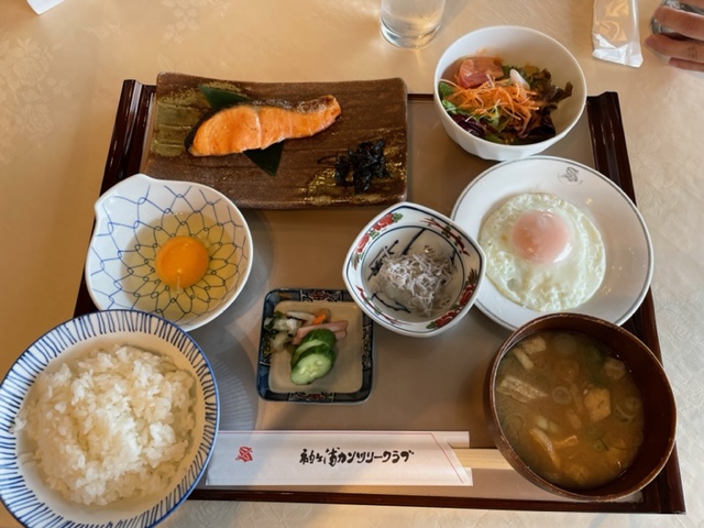 ランチは、朝のメニュー和朝食であります。鮭が美味いし、納豆は目玉にしてくれますし、卵かけご飯にも出来ましたし、最高でした。
