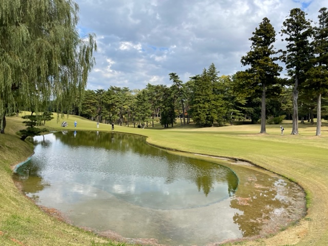 16番487y左ドッグのロングは、ドライバーは完璧のはずだったが、テッペンに当たったようで真下に。6アイアンでナイスフック。52度で5mに3オン。残念パー。同じく3オンからKさんも無難にパー。