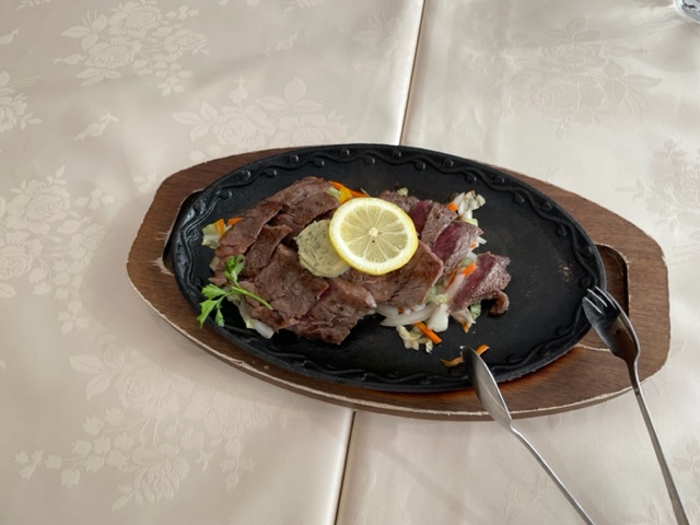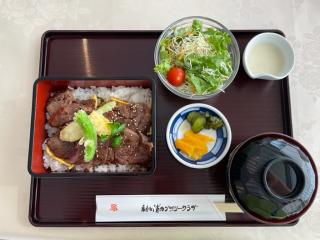 ランチは、ステーキ丼をオーダー。3人がそれを頼んだが、T.Nさんが安価なカレーをオーダーされたので、私はそのカレーは私につけて、このつまみのステーキを皆でシュアするからそれをT.Nさんのランチにして~、とする。無論オッケーです。つまみのステーキとステーキ丼のソースが違うので、とてもナイスでした。