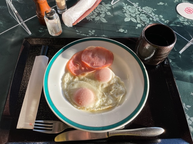 まずは、ハムエッグを食しながら、数名の方々とミーティングです。その後、パターを転がして、中コースから。今日はニューグリーンの青ティ進行です。