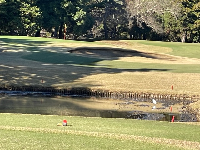 1番524yロングは、ドライバーはフェアウェイへ。3w、7アイアンでバンカーイン。出ず。寄らず入らずダボ。