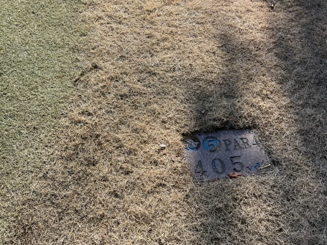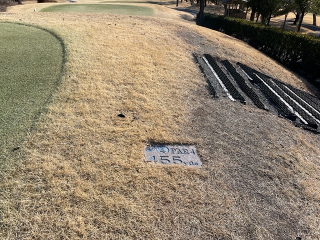 7番405yミドルは、ドライバーは右ラフへ。残り180yから3uで打つも左のクリークをやっと越えた位置に。ここからトップ。4打目も乗らず。やっとのダボ。