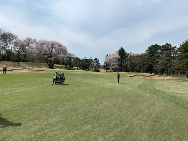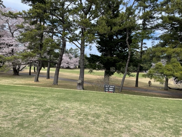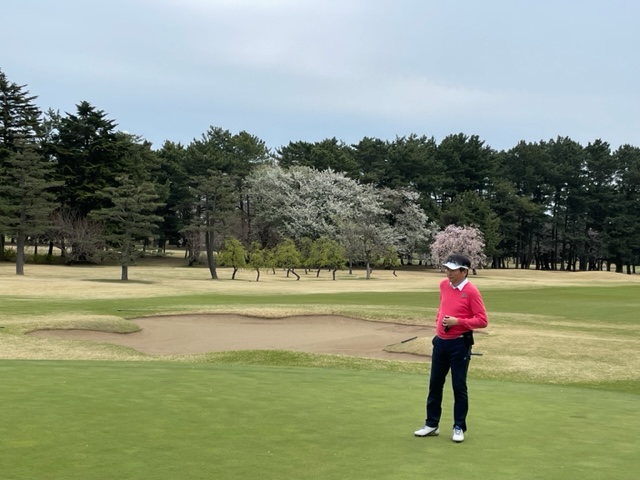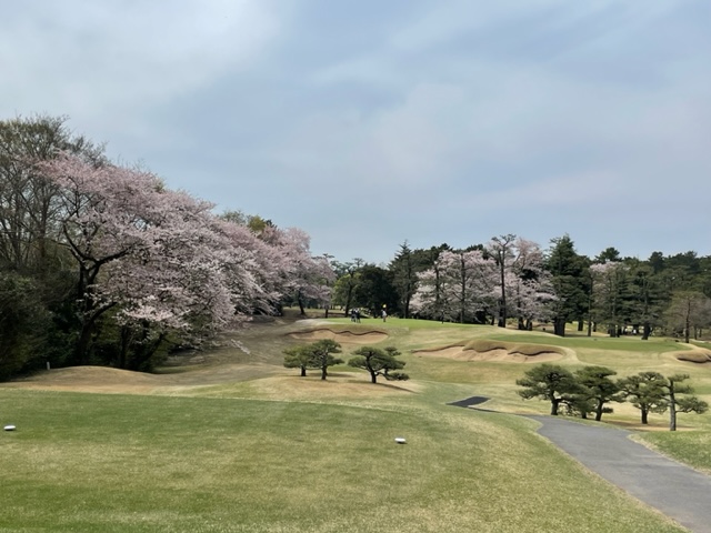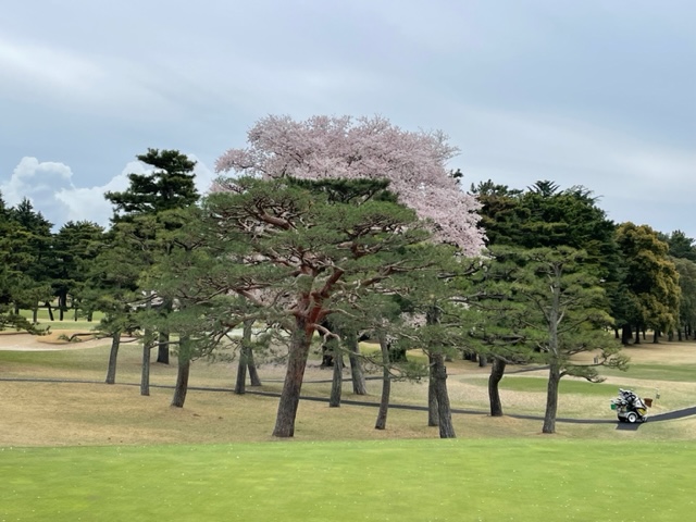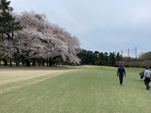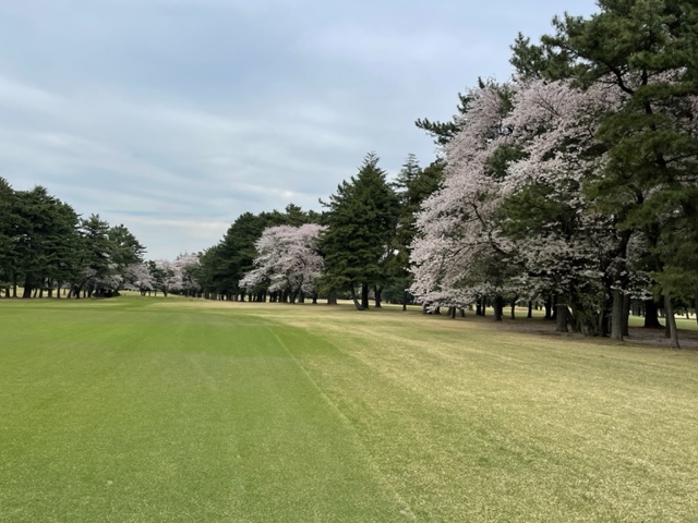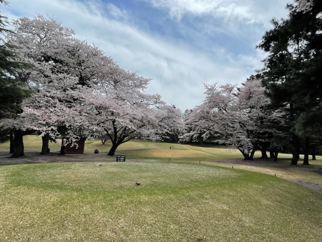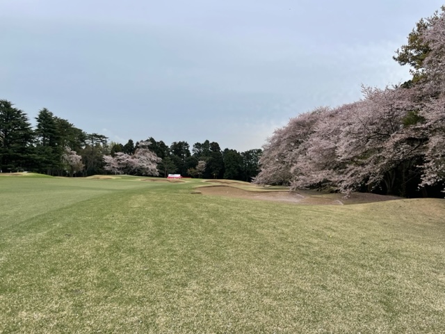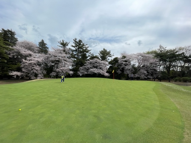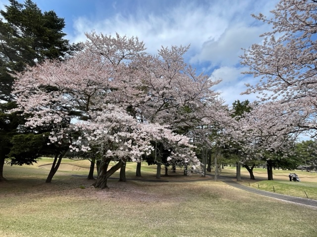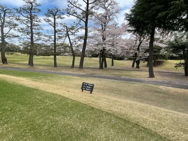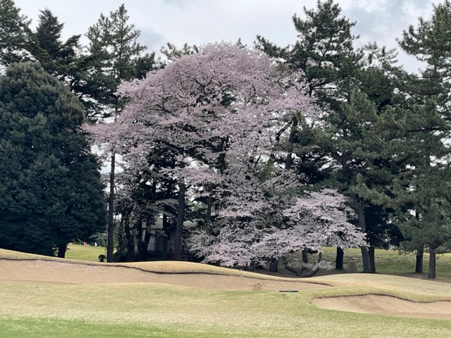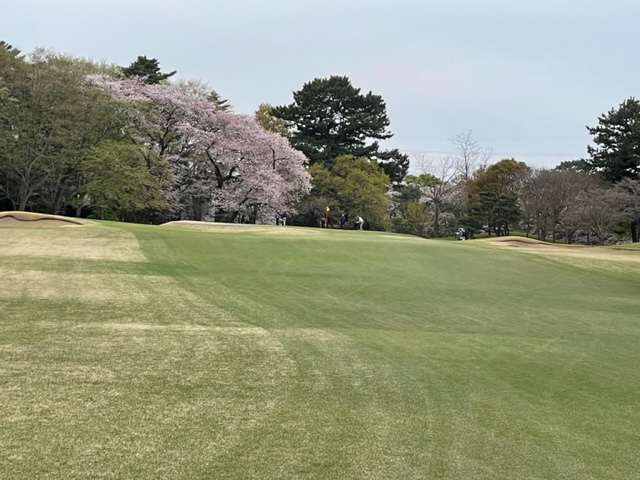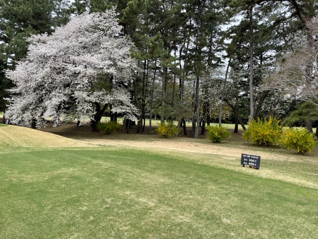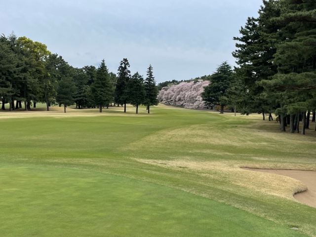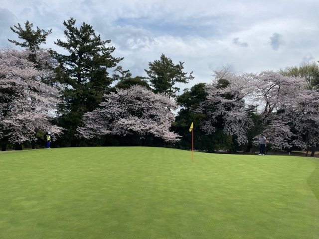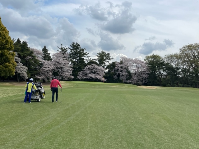 17番桜が美しい374yミドルは、ドライバーは右の松の木の裏へ。8アイアンで打つもちょいと手前。ナイスアプで鉄パー。