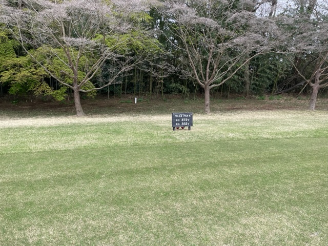 12番338y桜とスミレが最高の338yミドルは、ドライバーはまずまず。52度が完璧。1mを沈めてナイスバーディ。見事な2オンからK.TさんとK.Mさんが無難にパー。