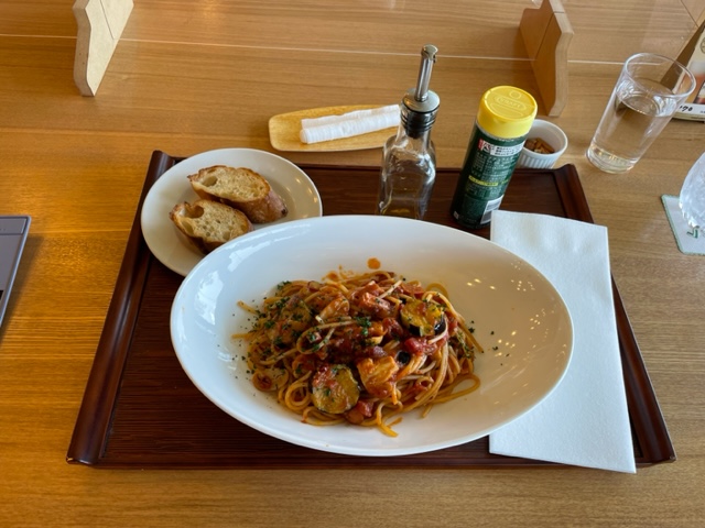 ランチは今日もパスタ。トマト味の茄子入りのアラビアータ。なかなかグー。