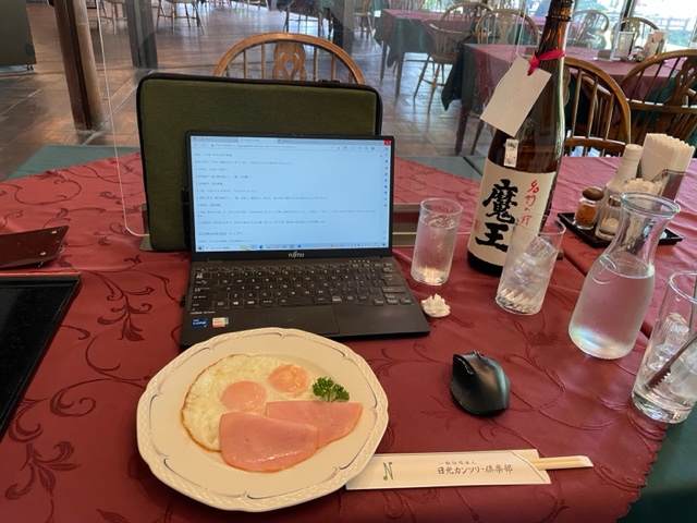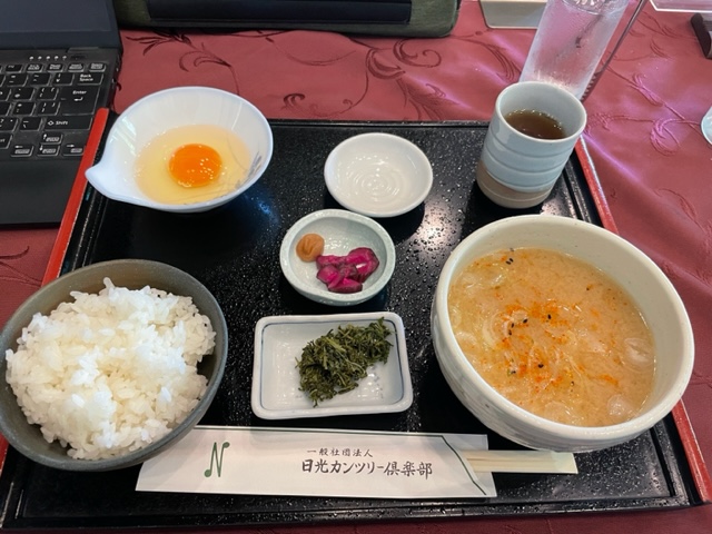 まずは、着替えて、朝食タイムです。ハムエッグに始まり、その後は朝一和膳に移り、日光脇の小川の音を聞きながら、静寂のひと時を過ごします。