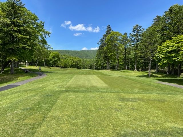 11番585yロングは、ドライバーは左へ。木に当たる。3w、3uで右へ。寄らず入らず。