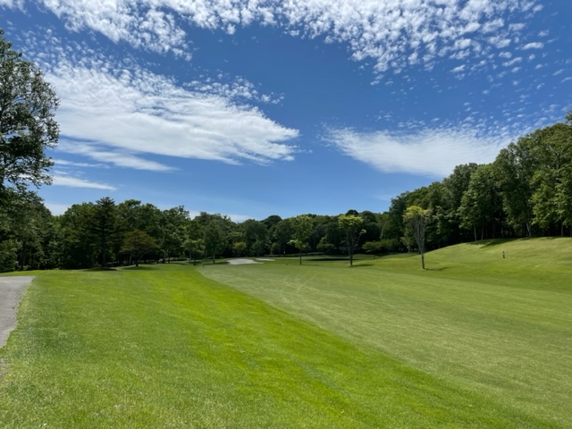 9番496y左ドッグのロングは、ドライバーは竜巻球でOB。打ち直しはセンターへ。3w、9アイアンで打つも奥のバンカーイン。寄らず入らず8。